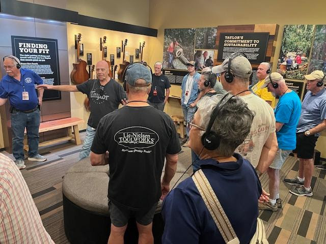Taylor produces (brace yourself) about 1,000 perfect, new guitars…..each day! What was truly impressive was seeing the dozens of dedicated employee/owners crafting each one with incredible attention to detail. SDFWA Members in attendance had a great opportunity to see and ask questions about the glues used, finishing procedures, the importance of humidity in the shop, and much more.